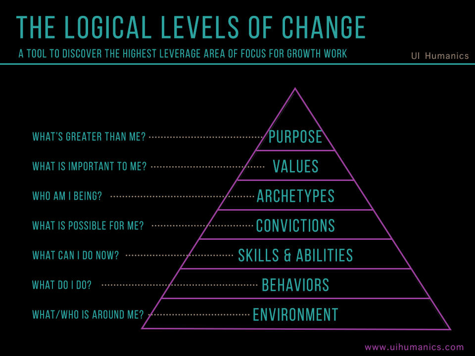 Hopefully now you can see how these levels are useful in choosing an area for targeted growth work. By asking yourself or your clients questions that target a particular area, you can work your way up and down the levels until you find the point of highest leverage.Making a recommendation or suggestion at that point will almost always be well received.If you would like support in your personal development journey, please contact us and begin the conversation.